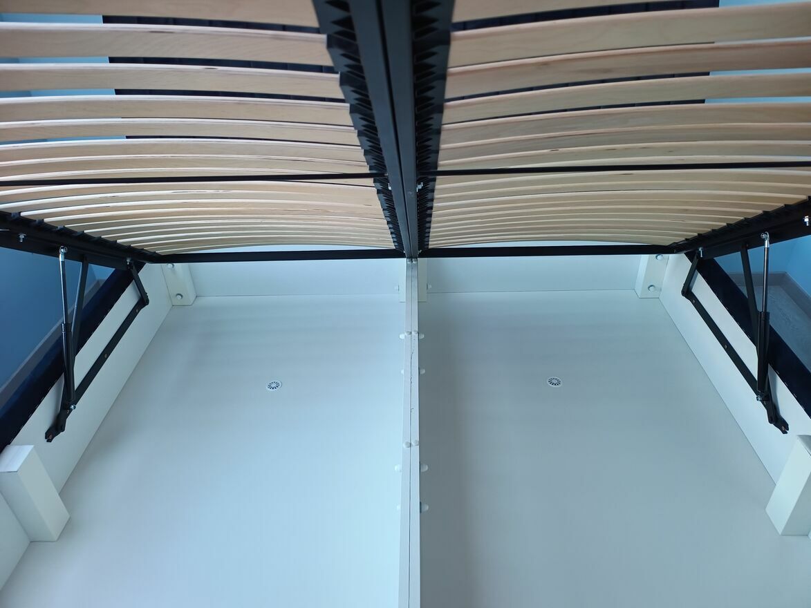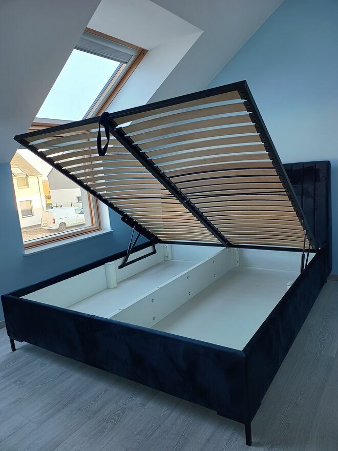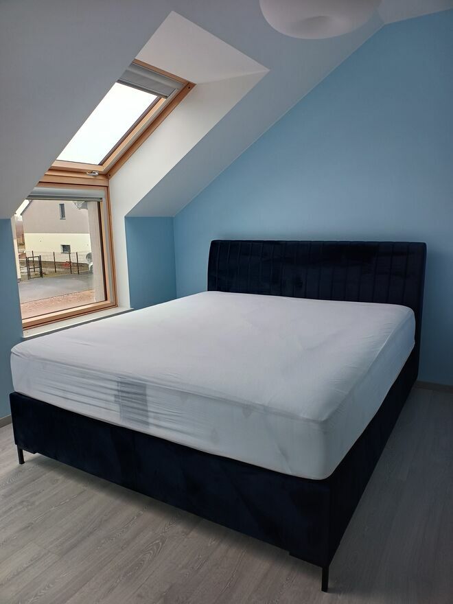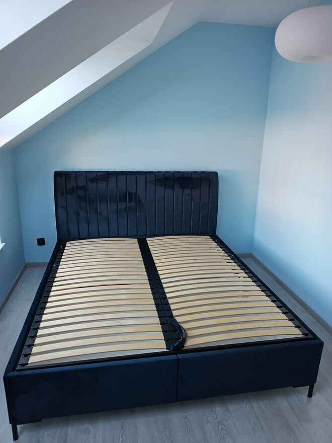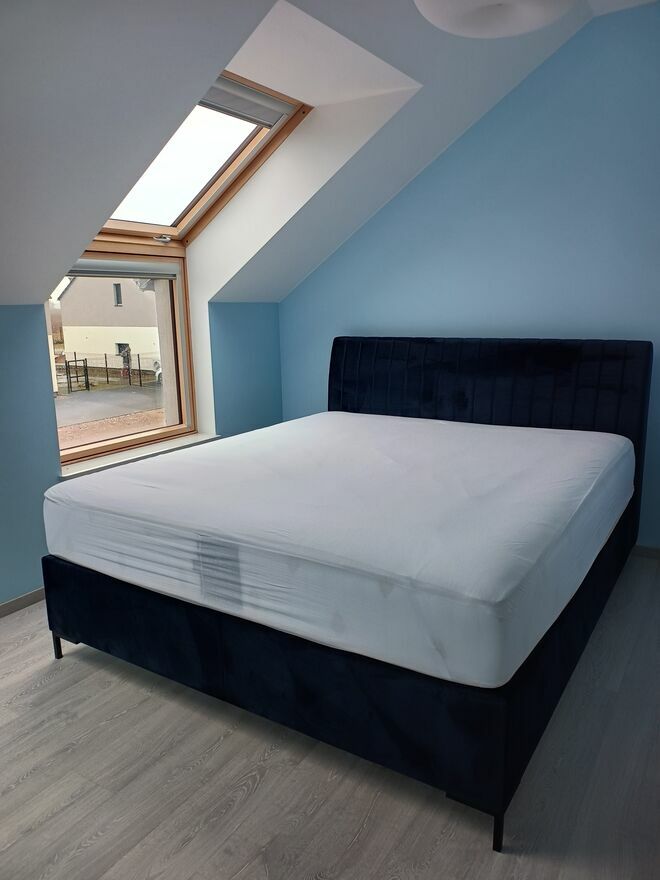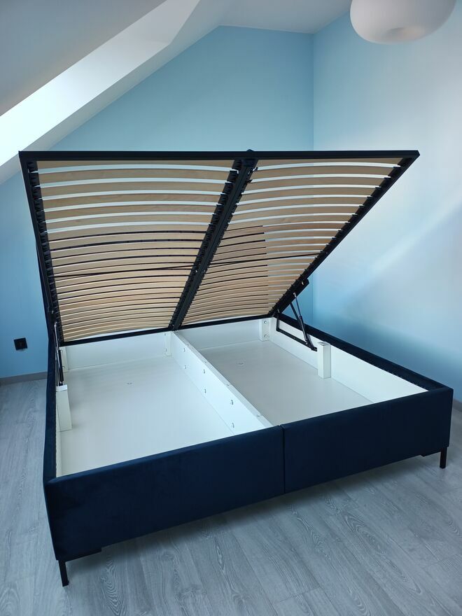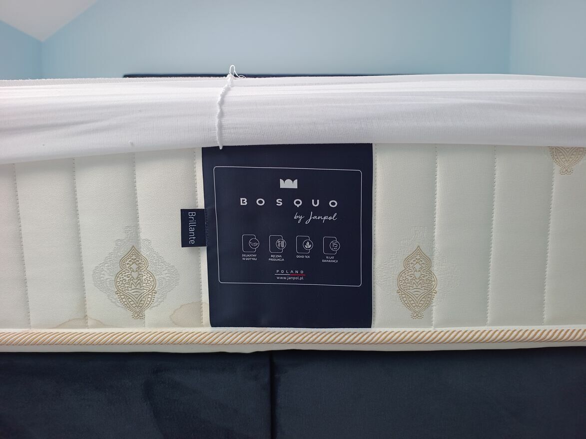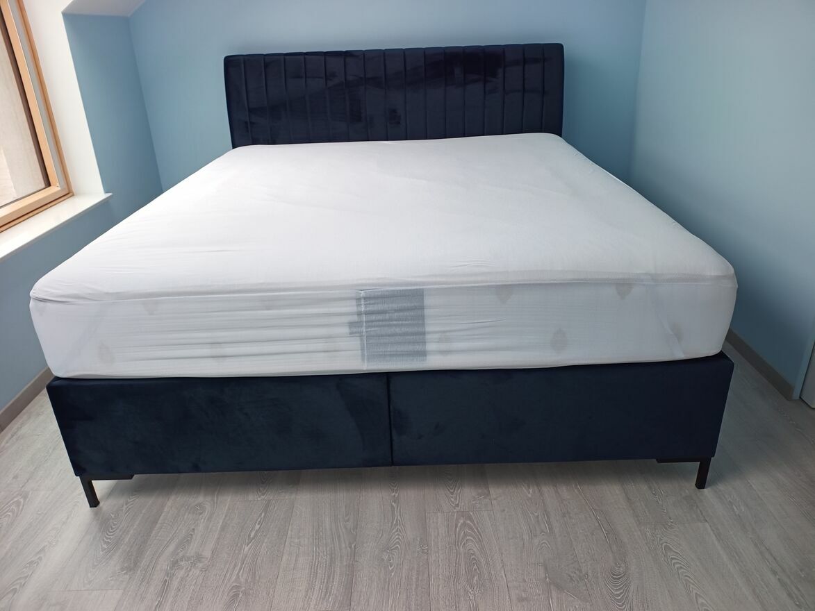 Łóżko tapicerowane z dwuczęściowym pojemnikiem na pościel 180x200 cm, wysokość wezgłowia z nogą 115 cm, wysokość pojemnika z nogą 42 cm + materac kieszeniowy JANPOL Brillante 180x200 cm z pokrowcem, wysokość ok.27 cm.Katarzyna Wiśniewska